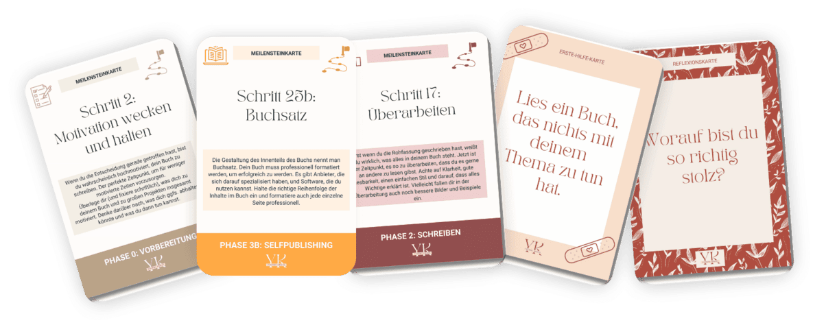 Mit den Meilensteinkarten kannst du dein Buch planen, schreiben und veröffentlichen. Und du erhältst auch Unterstützung, um dranzubleiben.